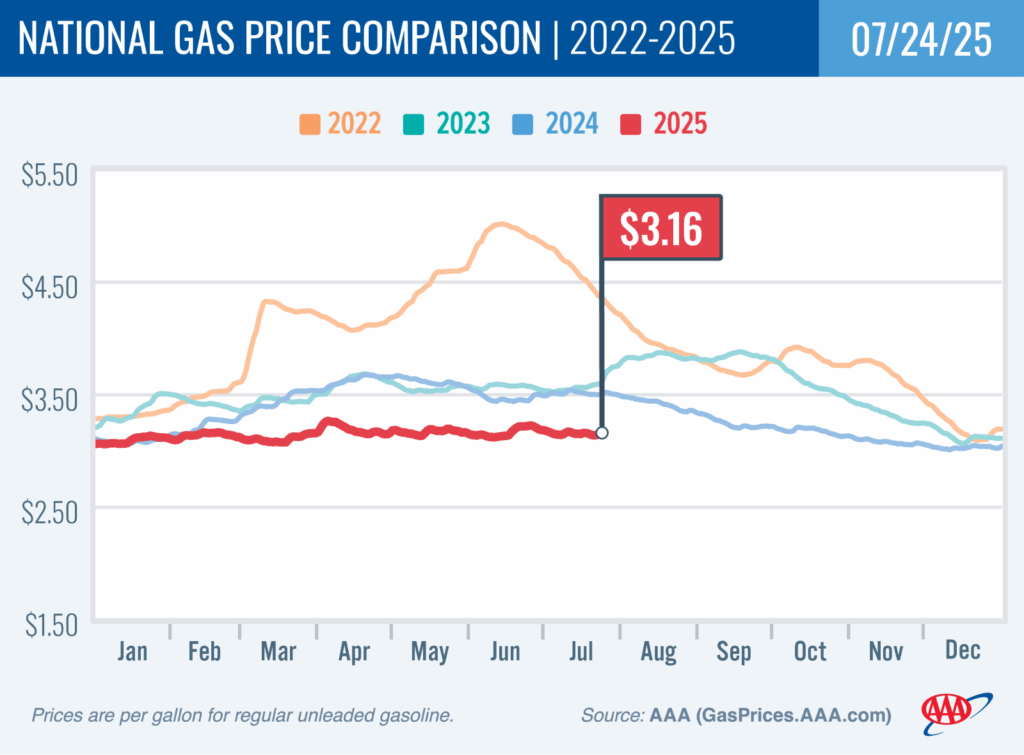 Drivers are feeling the slower pace of summer at the pump as gas prices remain steady. The national average for a gallon of regular is back at $3.16 after dropping a couple of cents this past week. The summer of lower gas prices continues thanks to crude oil prices averaging around $65 a barrel. Pump prices so far in 2025 haven’t had any major spikes or dips compared to other recent years.